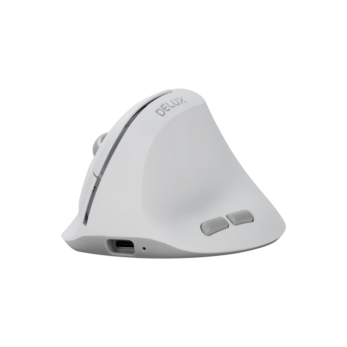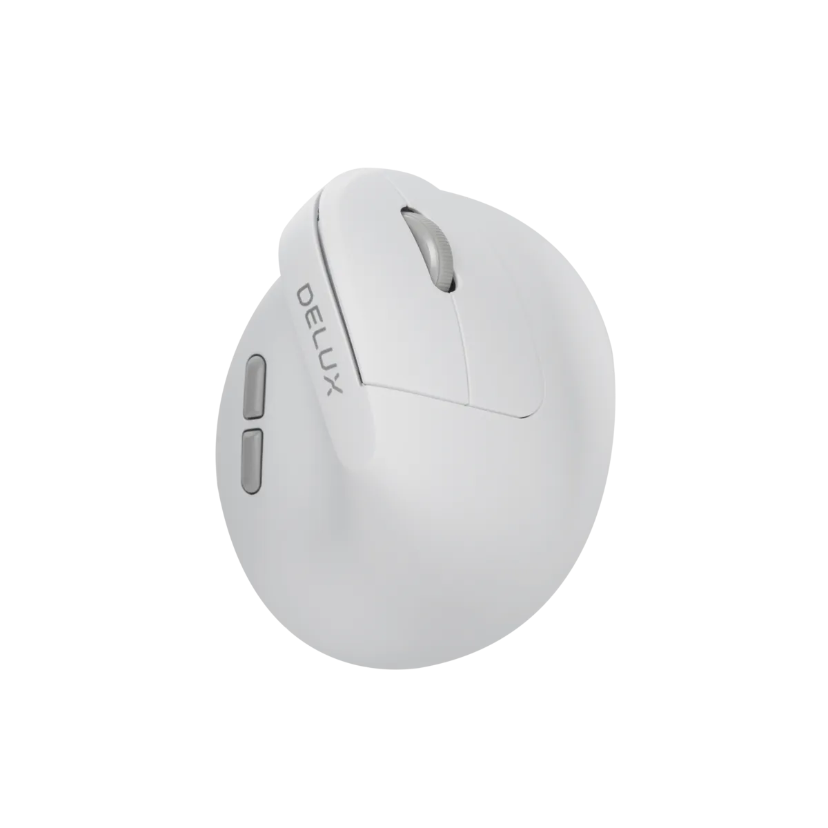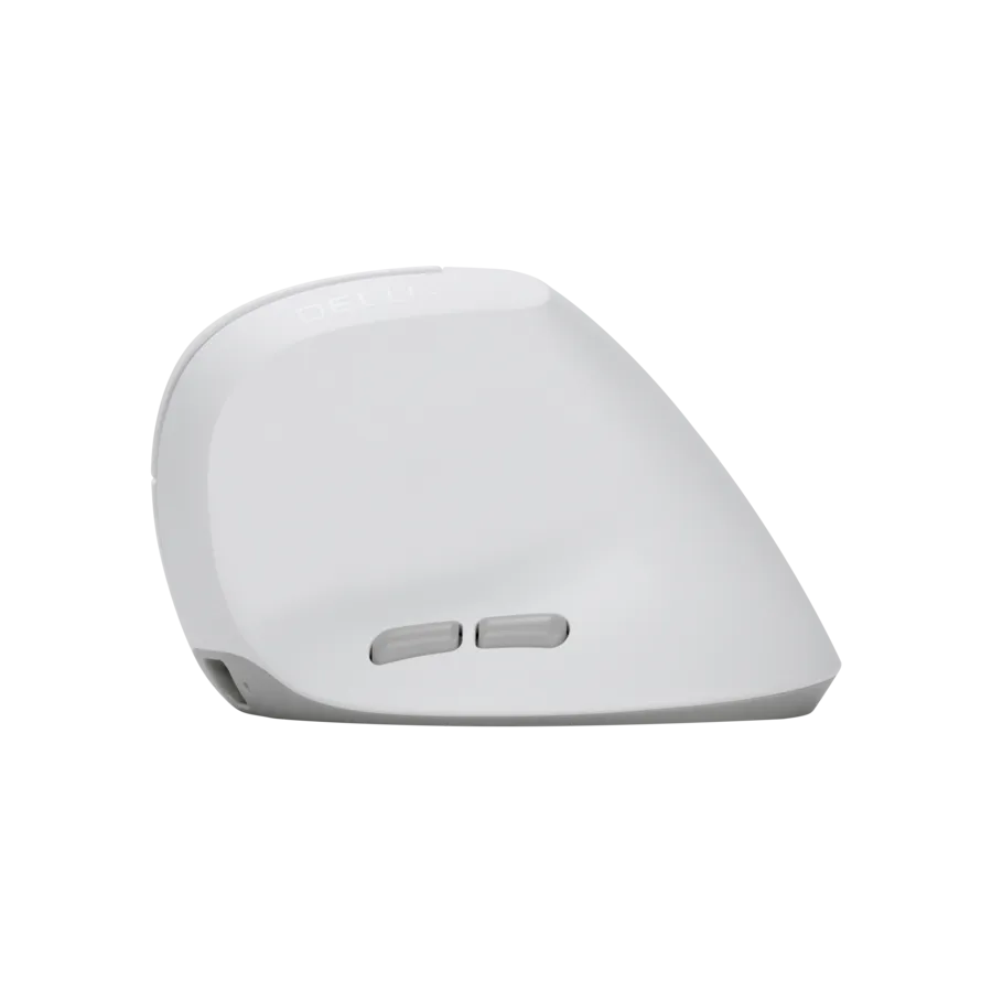 De Delux M618 Air is een rare combinatie, op een goede manier. Verticale muis, dus lekker vriendelijk voor je pols, maar ondertussen ook gebouwd voor tempo. 84 gram, stille knoppen bovenop, en via de USB-ontvanger polling tot 1000 Hz. Je hoort ‘m bijna niet, maar je merkt ‘m wel.