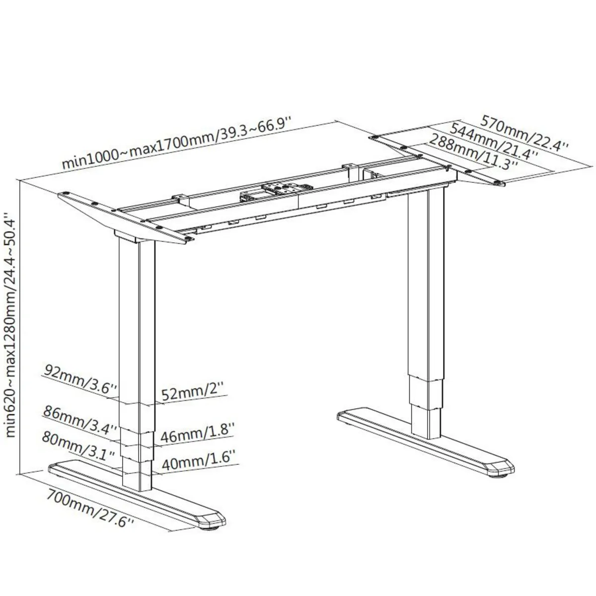 | Minimale hoogte | 620mm (gemeten zonder bureaublad) |