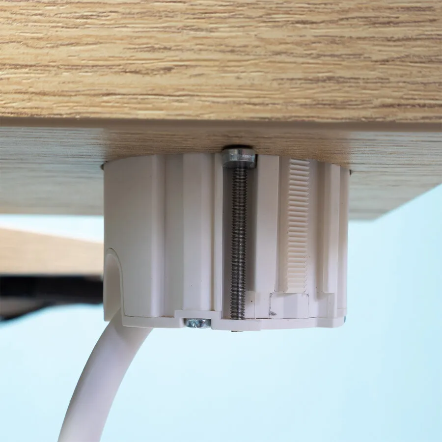 Allereerst heb je een boorgat nodig van 54 mm. Deze Volt_In Ring kun je in het bureaublad klemmen met behulp van de bevestigingsring die je op de Ring kunt schroeven. Daarvoor moet je wel bij de achterzijde kunnen. Lukt dat niet, dan kun je er ook voor kiezen om hem te klemmen middels de schroefklemmen. Deze zijn verstopt onder het afdekring van de Volt_In Ring. Hierdoor kun je hem bijvoorbeeld ook inbouwen in een meubel, kast of zelfs in een holle wand.
