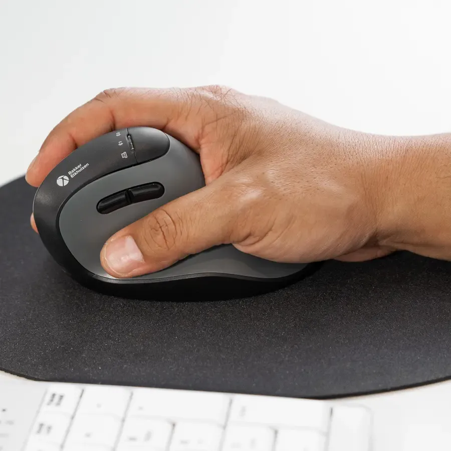 De FastForward Pro heeft een verticale vormgeving. Je hand staat daardoor in een meer neutrale positie, alsof je iemand een hand geeft. Dat vermindert de draaiing in je onderarm en verlaagt de spierspanning. Vooral bij langdurig computerwerk merk je het verschil.