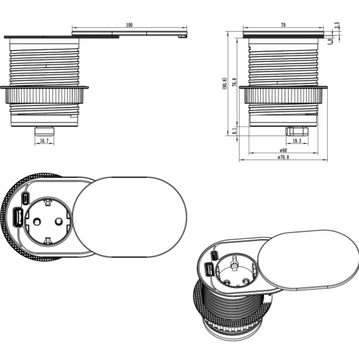 - Strakke inbouw in 60mm kabelgat