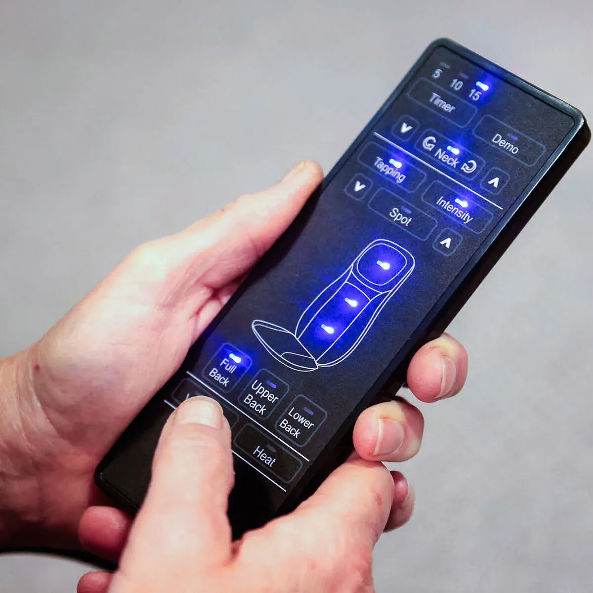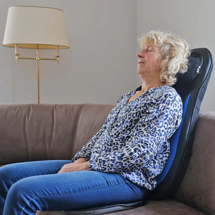 Waar de rugvariant ophoudt, gaat deze door: dezelfde fijne rugmassage, plus een verstelbare nekmassage die je met de afstandsbediening op jouw lengte zet. Rug en nek kun je tegelijk laten masseren.