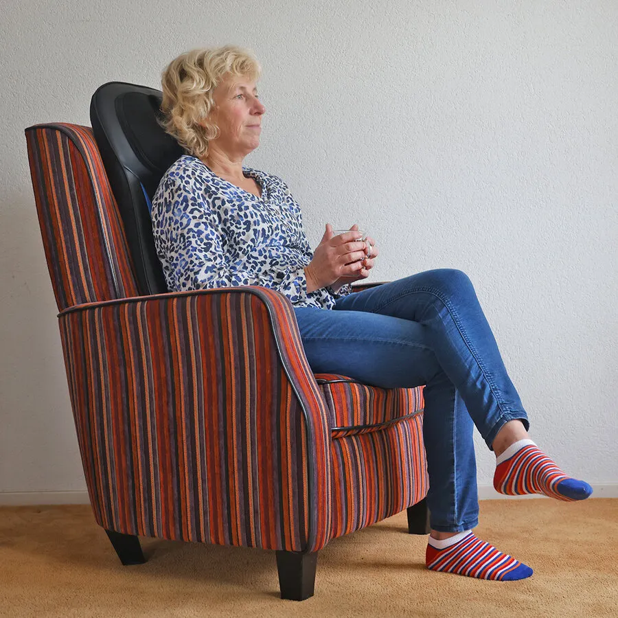 Stel de nekhoogte in terwijl je rechtop zit: breng de koppen ter hoogte van de onderrand van je schedel (niet tegen het achterhoofd). Zo voorkom je druk op botstructuren en haal je de meeste ontspanning uit de nek.