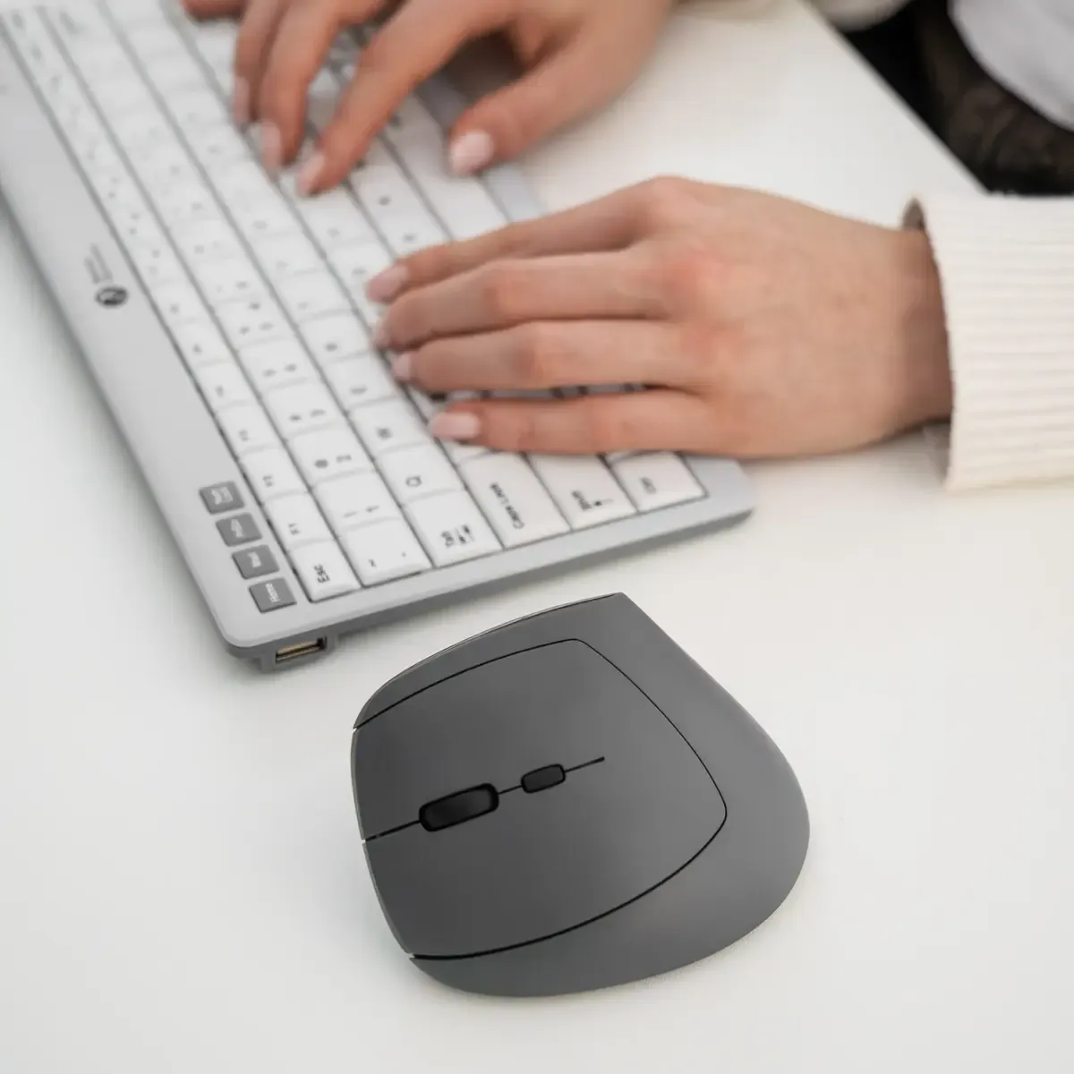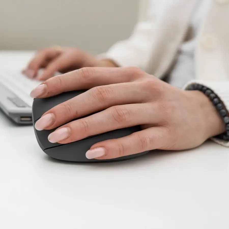 De MidWay plaatst je hand in een half-verticale houding. Denk aan de stand waarin je iemand een hand geeft. Daardoor draait je onderarm minder naar binnen dan bij een standaard muis. Minder spanning in pols en onderarm, meer rust tijdens lange werkdagen.