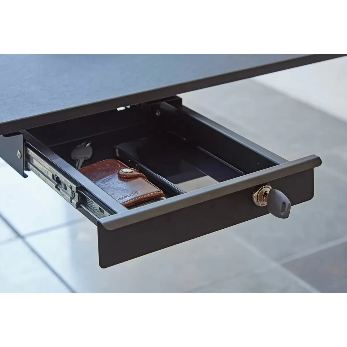 Doordat hij volledig uit metaal is vervaardigd voelt hij solide aan. De lade zelf is voorzien van een gelagerde rails, zodat hij altijd soepel open en dicht gaat. De bureaulade wordt geleverd met een pennenbakje, zodat je het aan de binnenkant ook netjes geordend kunt houden.