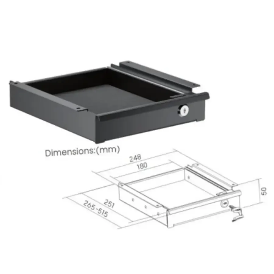 De diepte van de lade is altijd 265 mm. Dit is met opzet gedaan, zodat je niet in de knoei komt met de draagbalk onder je bureau. Controleer voor de zekerheid voordat je hem aanschaft of de ruimte onder je bureau beschikbaar is. De Ergopro 248 bureaulade heeft een binnenmaat van 180 mm breed bij 251 mm diep en een bruikbare hoogte van 50 mm.
