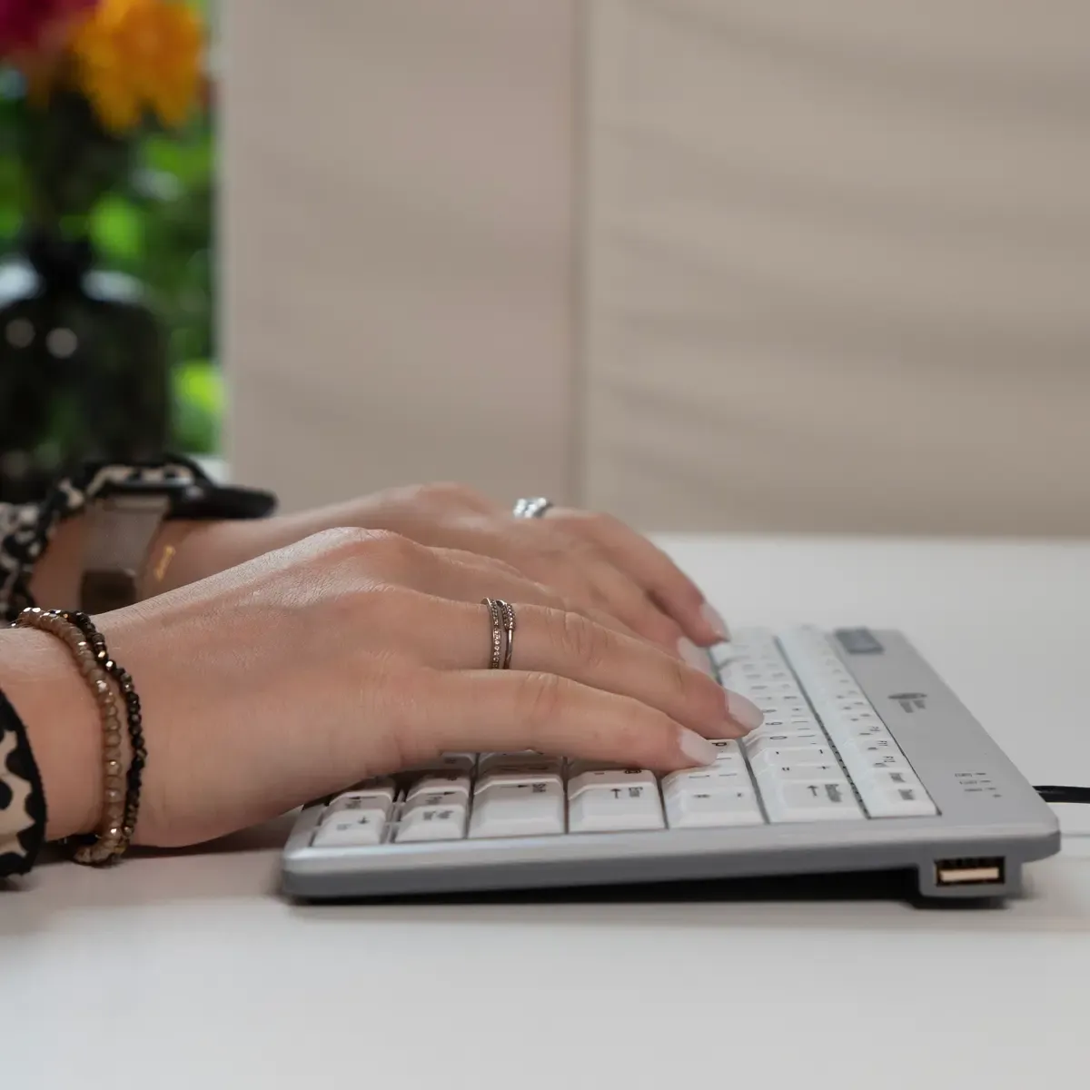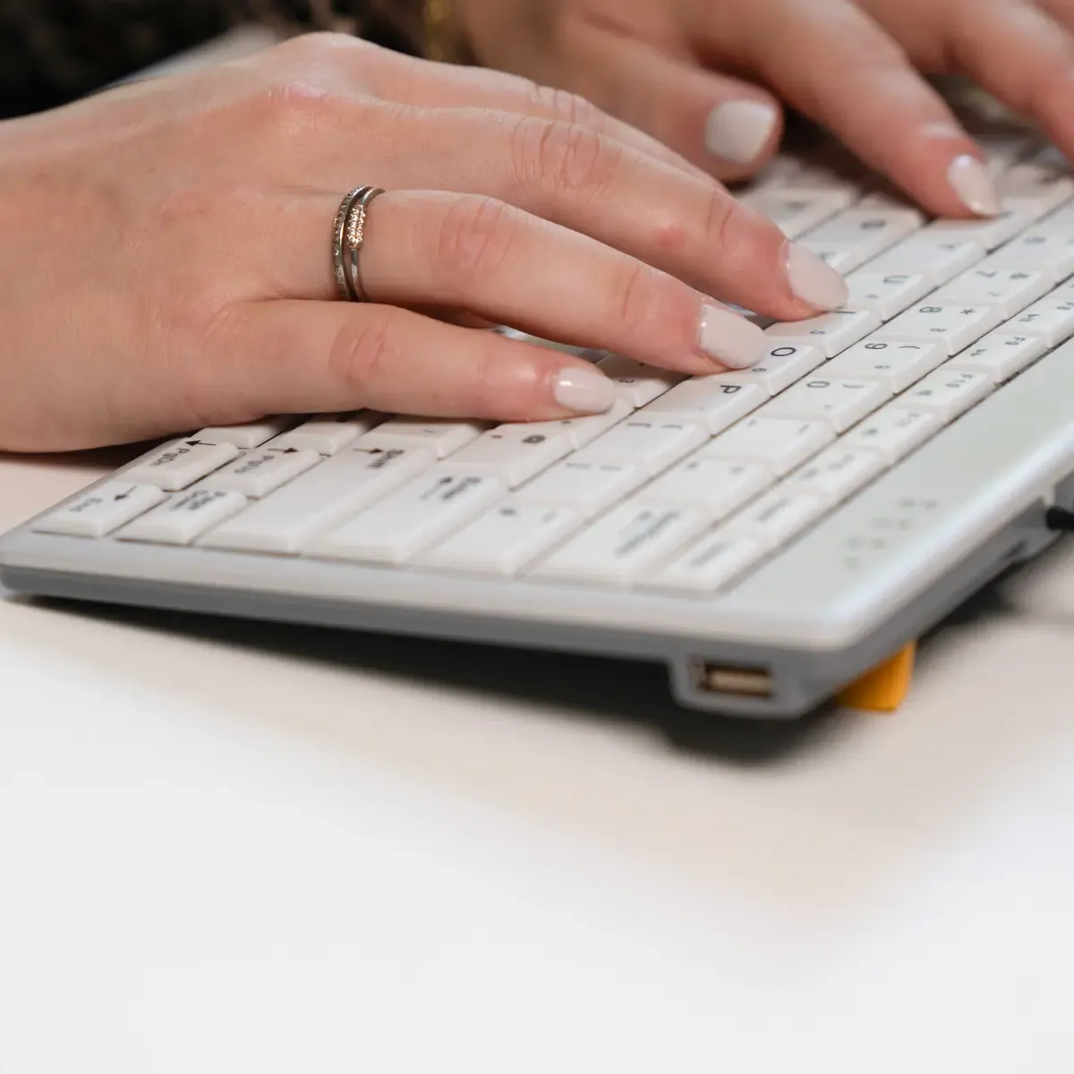 Doordat het toetsenbord compact is (zonder traditioneel numeriek deel) verklein je de afstand naar je muis. Je werkt makkelijker “inline”: toetsenbord voor je, muis dichtbij, schouders minder naar buiten geduwd. Dat is precies waar je lijf vaak om vraagt op lange dagen.