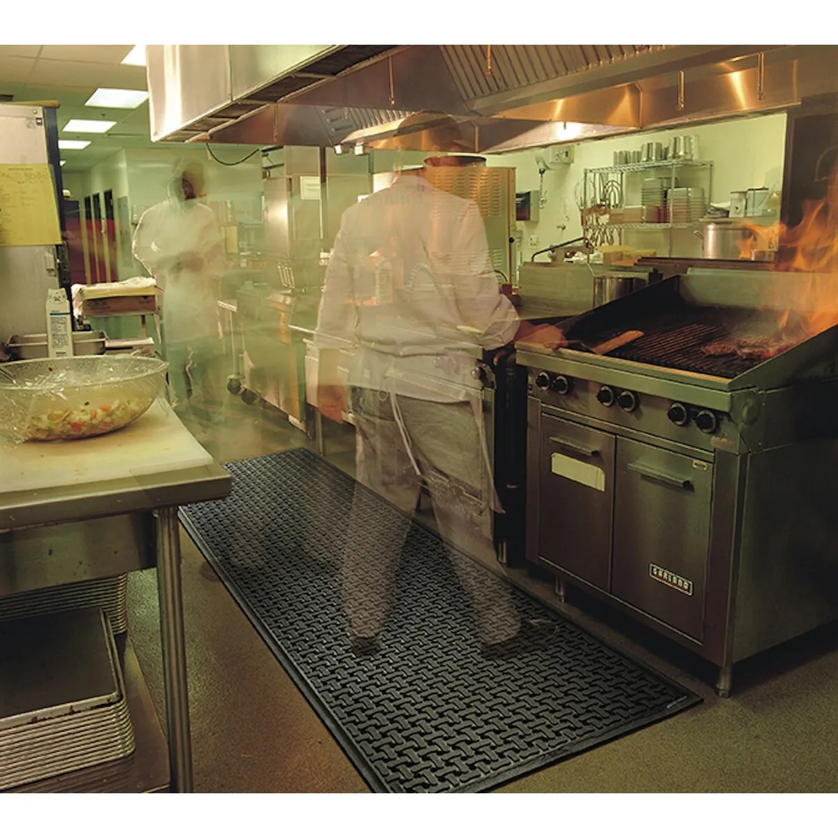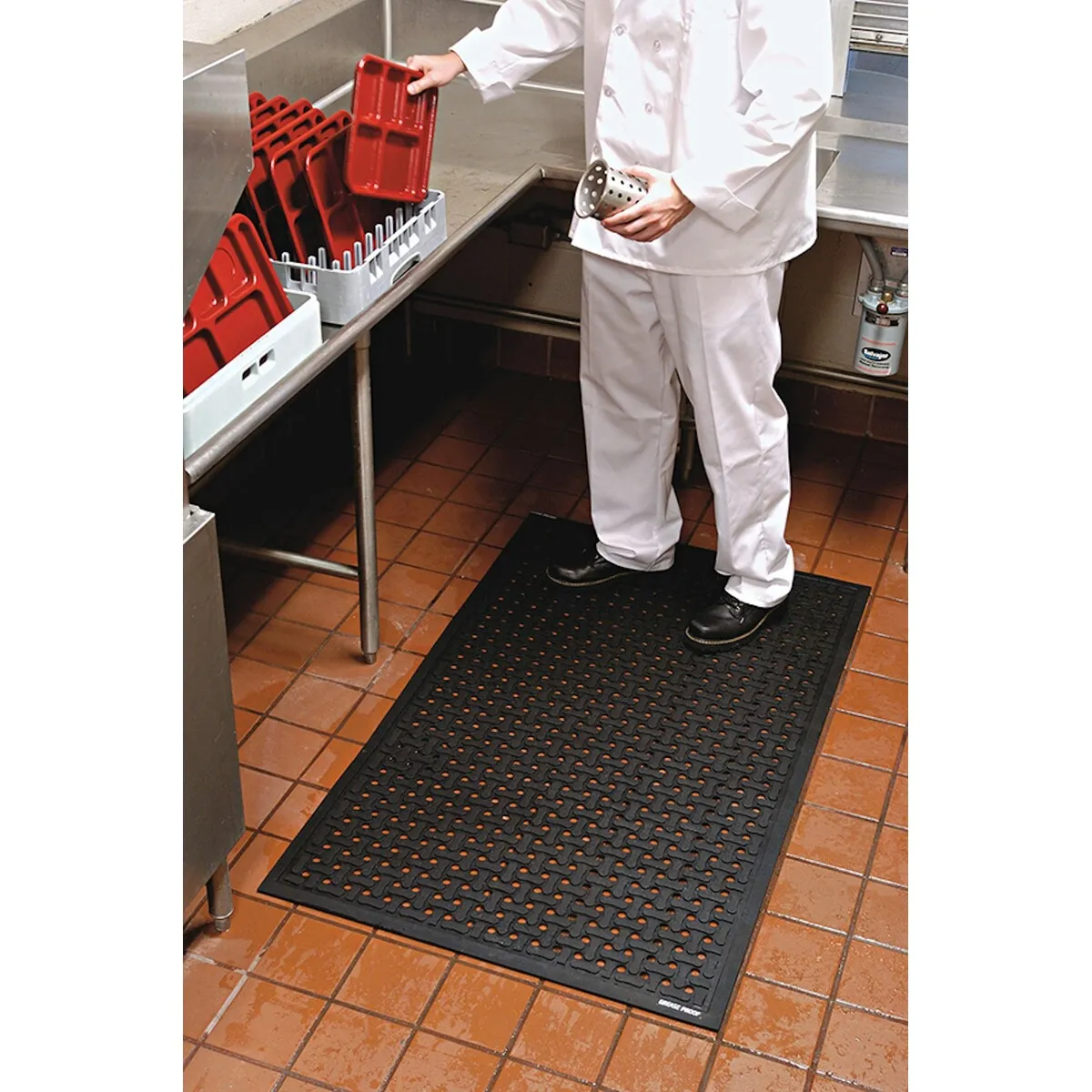 Denk aan commerciële keukens, werkplaatsen, voedselverwerking of spoelruimtes. Precies de plekken waar een gewone mat vaak snel nat of glad wordt.