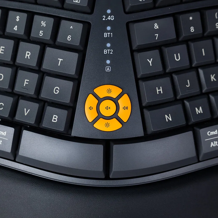 De Split is enkel draadloos, maar wel draadloos in overvloed. Je kunt hem zowel via een USB ontvanger verbinden als middels 2 bluetooth kanalen. Dit stelt je in staat om te schakelen tussen 3 apparaten. Denk aan je computer, laptop en telefoon. Rechtsboven zitten 3 oranje knoppen die, wanneer je eenmaal verbinding hebt gemaakt met je apparaten, je in staat stellen om te schakelen van apparaat. De ontvanger kan in een compartimentje onderin het toetsenbord worden opgeborgen, die raak je dus nooit meer kwijt.