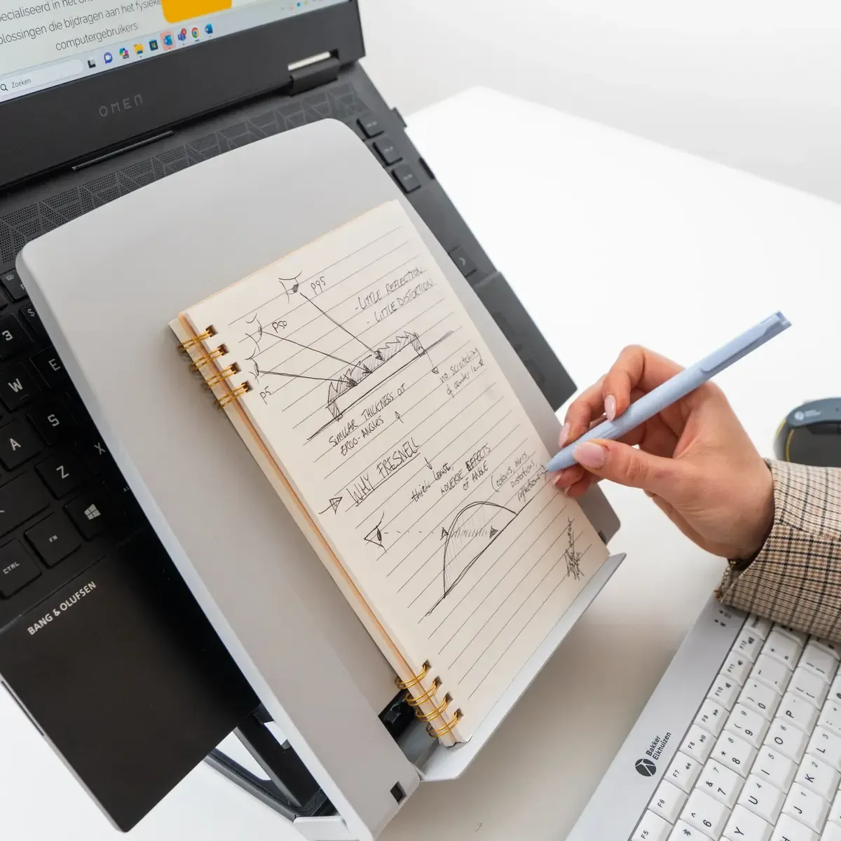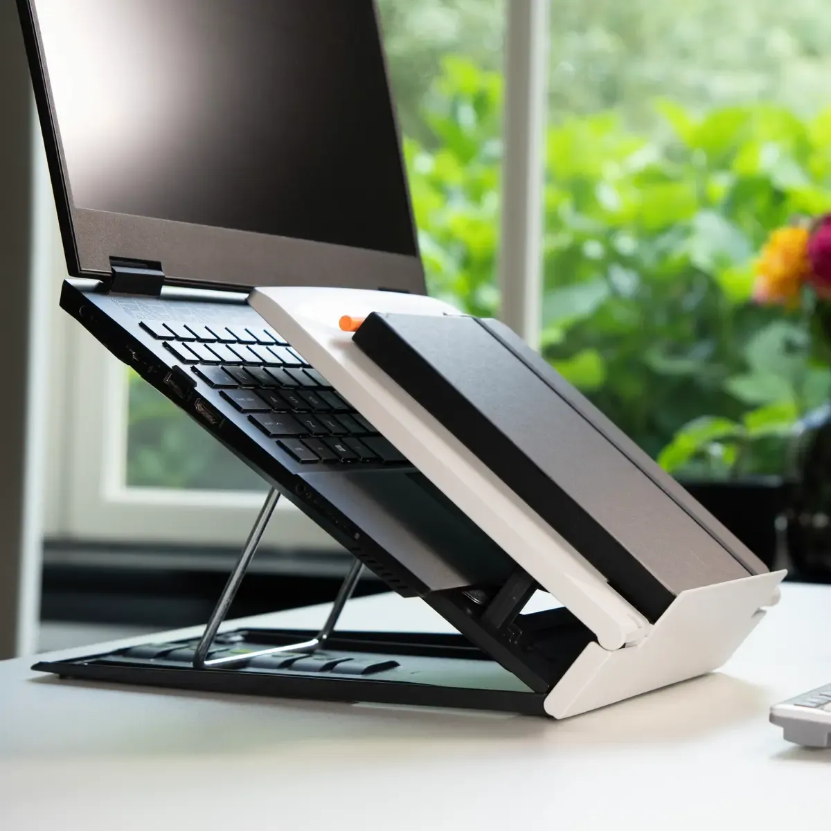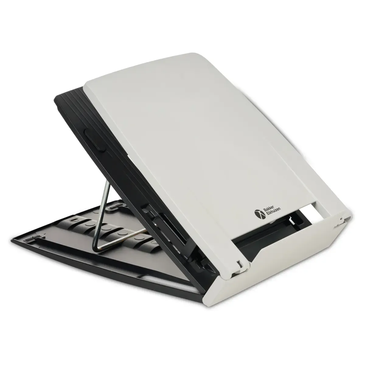 Klap uit, kies de hoogte en zet de beugel in één van de sleuven aan de achterkant. Daarna klap je de documenthouder open en plaats je je laptop erin. Simpel, stevig, klaar.