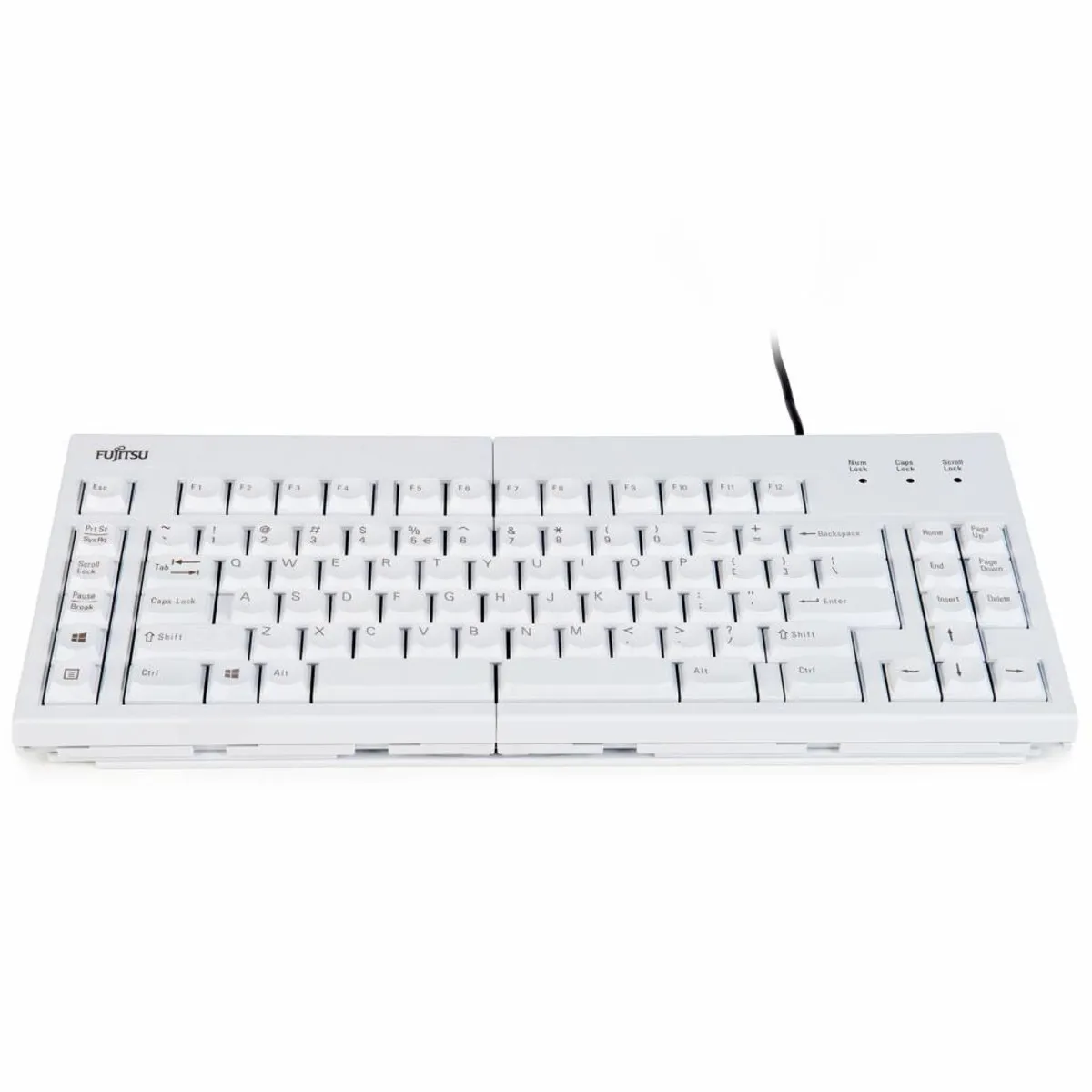 Dit Fujitsu toetsenbord valt gelijk op vanwege de mogelijkheid om hem te splitsen in twee even grote delen. Daarnaast kan je als je dat wilt, dit ergonomische toetsenbord aan de beide kanten omhoog zetten, zodat je handen in een zo natuurlijk mogelijke houding kunnen werken. De hoogte van het toetsenbord kan eenvoudig versteld worden in twee standen aan de onderzijde. Daar bevindt zich een ‘trap’ systeem om dit te kunnen doen.
