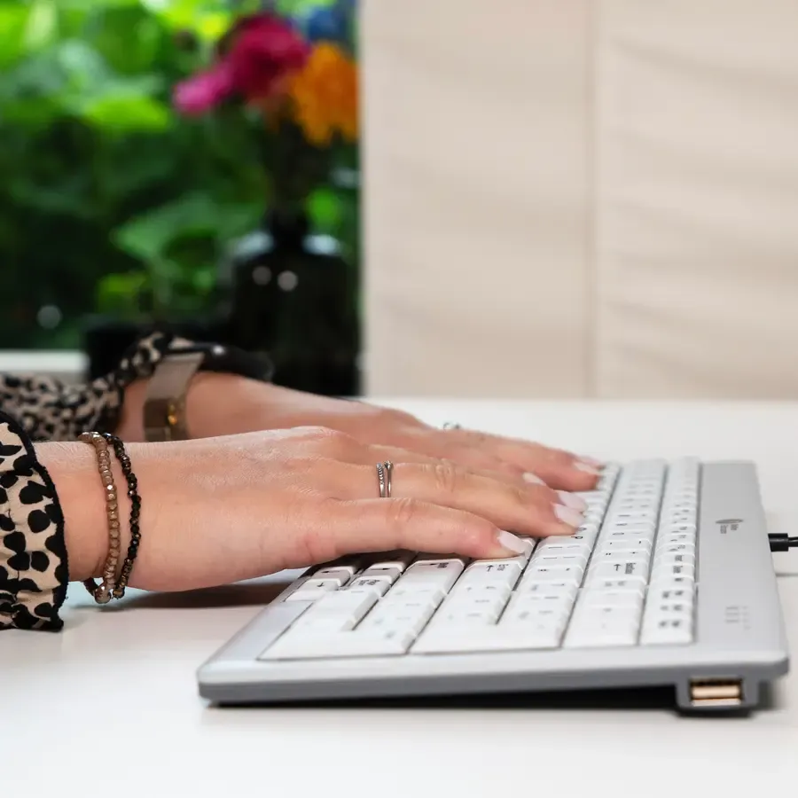 Compact werken helpt je houding te centreren. Minder “uitwaaieren” met je arm, meer werken binnen schouderbreedte. En omdat dit toetsenbord lekker plat is, houd je je polsen makkelijker in een rechte lijn.