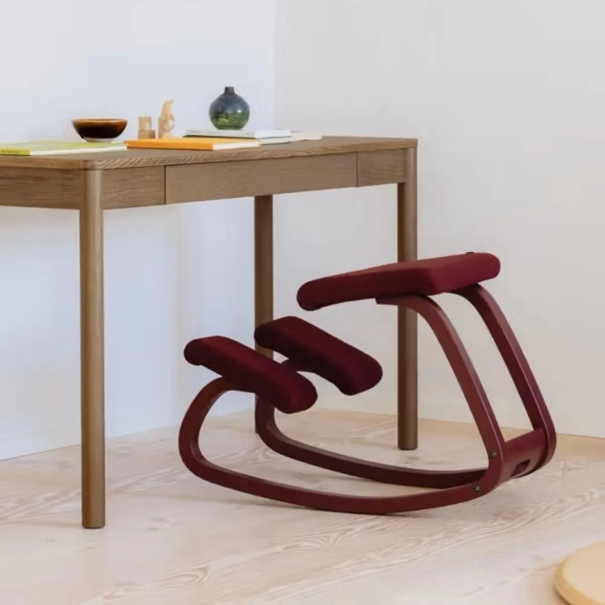 Bij de Varier Variable Monochrome Kniestoel draait het niet om zo lang mogelijk in één houding blijven. Juist niet. De kussens onder de zitting zijn er om je schenen te ondersteunen en je in balans te helpen, niet om al je gewicht te dragen. Het grootste deel van je gewicht hoort gewoon op de zitting te rusten. Je kunt knielend zitten, één voet op de grond zetten, beide voeten op de grond houden of tussendoor wat traditioneler zitten. Die afwisseling maakt het verschil.