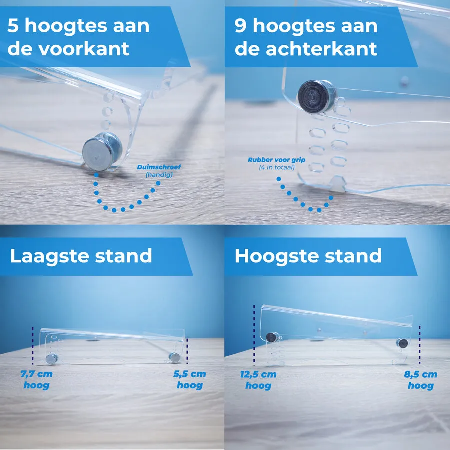 Je kunt kiezen uit 45 verschillende hoogtes en hoeken. De helling blijft daarbij rustig en comfortabel, ideaal voor lezen, overtypen of administratief werk. De vier duimschroeven maken het afstellen eenvoudig en precies, zonder dat de houder in een te steile positie komt te staan.