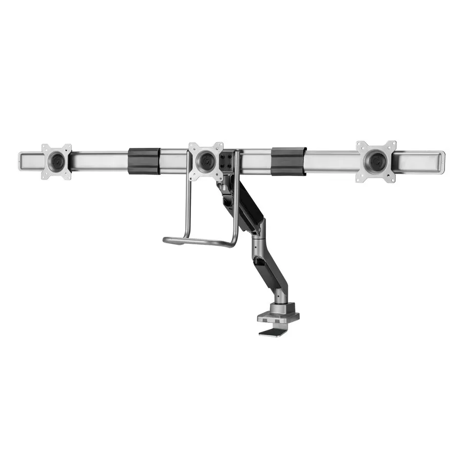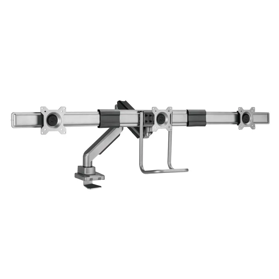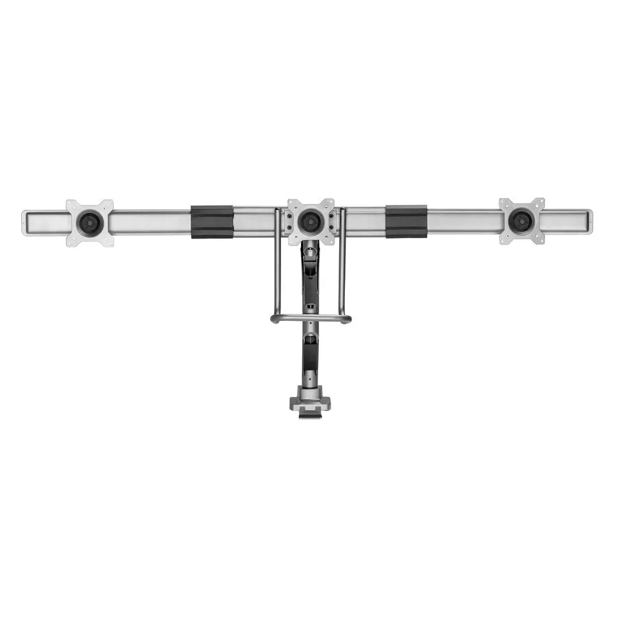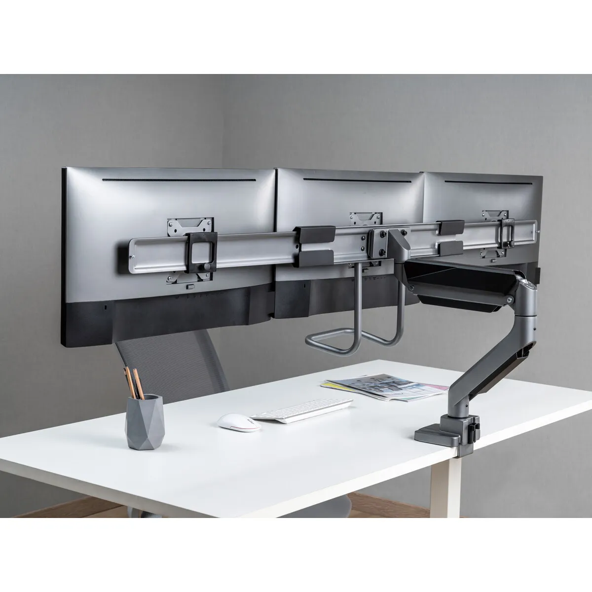 Dankzij de rail en het triple-arm ontwerp blijven alle schermen stabiel en netjes uitgelijnd. Je plaatst elk scherm volgens VESA 75×75 of 100×100, tot 6 kg per scherm — voldoende voor veel standaard schermen tot 27 inch.